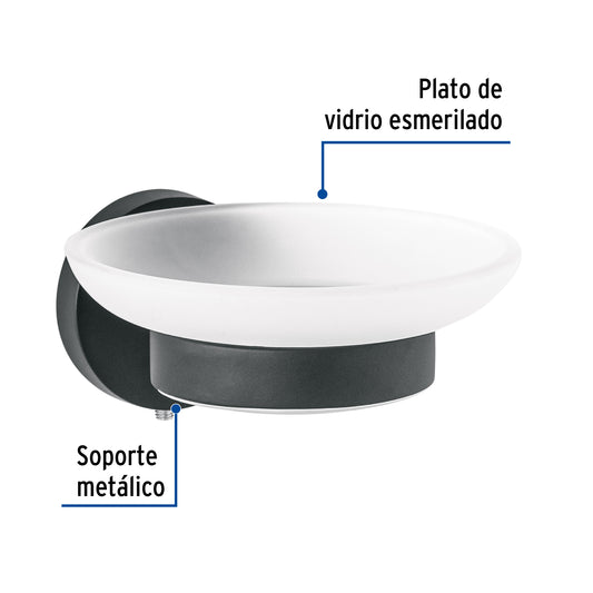 Proveedor:FosetJabonera metálica negro con plato de vidrio, Foset Túbig Caja con 6, 45966Plato de vidrio esmerilado Soporte metálico Con sistema de montaje para semiempotrar Incluye llave allen, taquetes y tornillería para su...