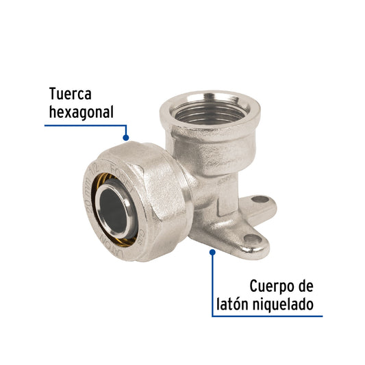 Proveedor:FosetCodo oreja 90° para PEALPE, 1/2', con rosca hembra, Foset Caja con 4, 45931Cuerpo de latón niquelado Resistencia a la corrosión Conexión por compresión, sin soldadura Compatible con tubería multicapa PE-AL-PE para gas...