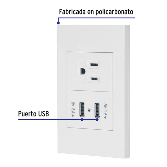 Proveedor:VolteckPlaca armada 1contacto, 2puertos USB, 1.5mod,Española,blanco Caja con 3, 45603Fabricada en policarbonato 1 Contacto 2 Puertos USB tipo estándar para cargar dos celulares simultáneamente o 1 tableta