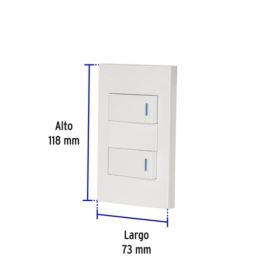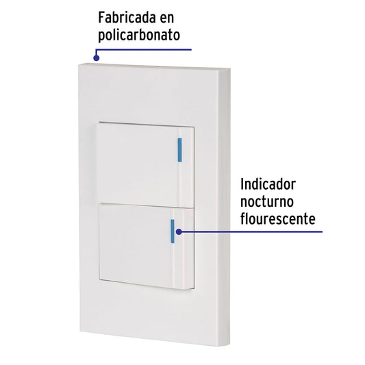 Proveedor:VolteckPlaca armada 2 interruptores 1de 3vías,1 mod,Española,blanco Caja con 3, 45602Fabricada en policarbonato Indicador nocturno fluorescente 2 Interruptores