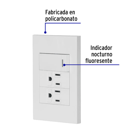 Proveedor:VolteckPlaca armada 2 interruptores, 1.5 módulos, Española, blanco Caja con 3, 45595Fabricada en policarbonato Indicador nocturno fluorescente 2 Interruptores sencillos