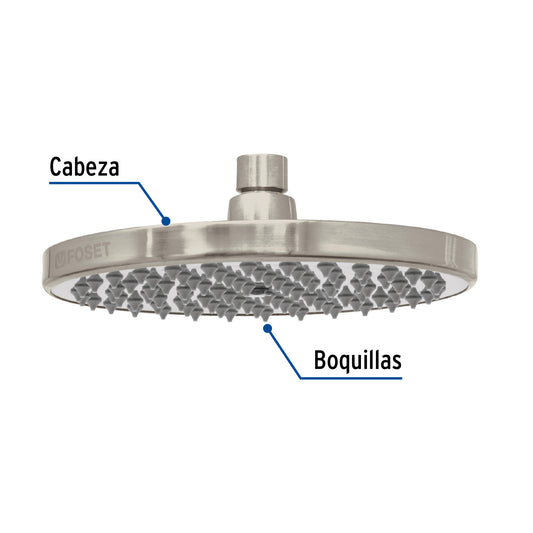 Proveedor:FosetRegadera satín 6' plato redondo, sin brazo, Foset Element, 45582Cabeza de latón para máxima duración Para mayor flujo de agua se puede retirar el reductor Ahorradora en baja presión...