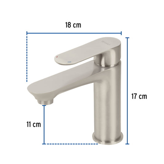 Proveedor:FosetMonomando satín cuello corto para lavabo, Foset Riviera, 45179Cuerpo y cuello de latón Maneral metálico Tubos conexión de cobre Cartucho cerámico de suave y fácil apertura