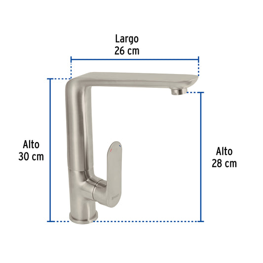 Proveedor:FosetMonomando satín cuello alto para fregadero, Foset Riviera, 45182Cuerpo y cuello de latón Maneral metálico Tubos conexión de cobre Cartucho cerámico de suave y fácil apertura