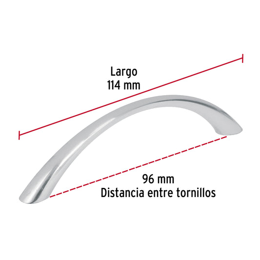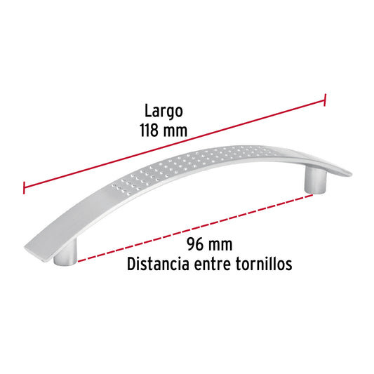 Proveedor:HermexJaladera metálica de 96mm estilo 'Arco', níquel satinado Caja con 12, 43824Metálicas con acabado níquel satinado Para uso en carpintería Ideal para instalar en puertas y cajones, para muebles de madera