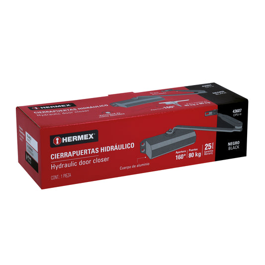 Proveedor:HermexCierrapuertas hidráulico color negro, Hermex, 43607Cuerpo de aluminio y brazo articulado de acero Con soporte paralelo para facilitar instalación 2 Válvulas independientes, una que controla...
