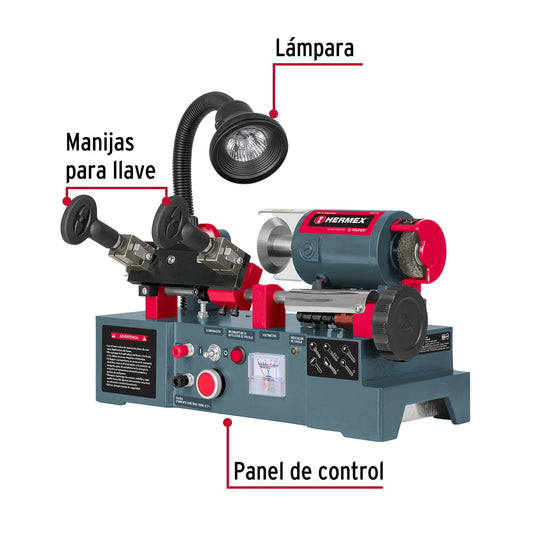 Proveedor:HermexDuplicadora de llaves, 6 tipos, Hermex, 43665Trabaja forjas para llave tipo: Planas y tetra Con iluminación Batería recargable integrada (12 V DC, 7 Ah)