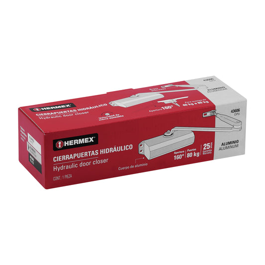 Proveedor:HermexCierrapuertas hidráulico color aluminio, Hermex, 43606Cuerpo de aluminio y brazo articulado de acero Con soporte paralelo para facilitar instalación 2 Válvulas independientes, una que controla...