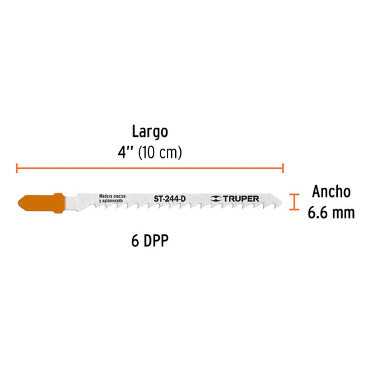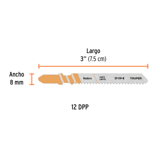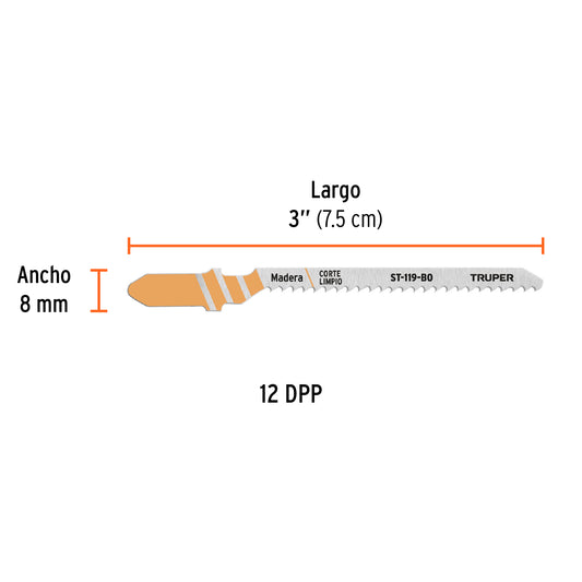 Proveedor:TruperBlíster con 5 seguetas 12 DPP zanco 'T' corte recto triplay Caja con 10, 18130Fabricadas en acero al carbono Corte limpio Zanco "T" compatible con otras marcas del mercado Para sierras caladoras modelos CALA-NX6,...