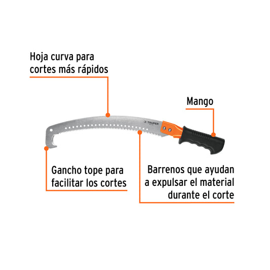 Proveedor:TruperSerrucho de poda 14' c/gancho,curvo,5 DPP,mango Comfort Grip Caja con 6, 18179Hoja curva para cortes rápidos, fabricada en acero al manganeso, resistente al desgaste con barrenos que ayudan a expulsar el material...