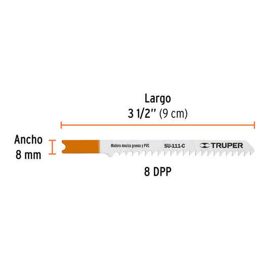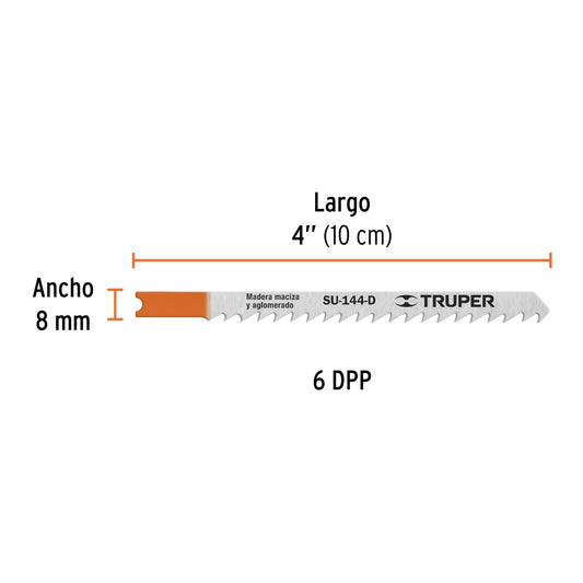 Proveedor:TruperBlíster con 5 seguetas 8 DPP zanco 'T' corte recto madera Caja con 10, 18127Fabricadas en acero al cromo vanadio Corte básico Zanco "T" compatible con otras marcas del mercado Para sierras caladoras modelos...
