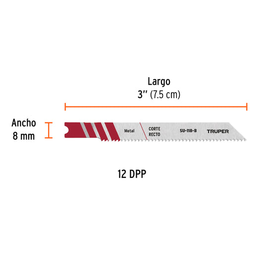 Proveedor:TruperBlíster con 5 seguetas 8 DPP zanco 'T' corte recto metal Caja con 10, 18132Fabricadas en acero alta velocidad Corte rápido Zanco "T" compatible con otras marcas del mercado Para sierras caladoras modelos CALA-NX6,...