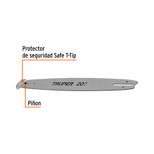 Proveedor:TruperBarra de repuesto 20' para motosierra a gasolina, Truper, 16634Barra de acero para máximo rendimiento Cortes rápidos y precisos Protector de seguridad Safe-T-Tip® que evita el contragolpe Para motosierras...