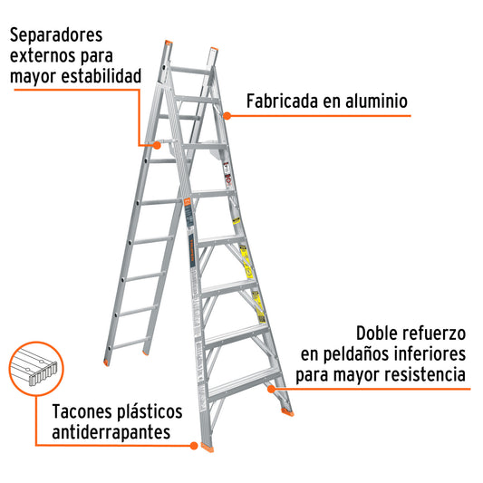 Proveedor:TruperEscalera convertible, tipo ll, 15 escalones, TRUPER, 16747Fabricada en aluminio Separadores externos para mayor estabilidad Doble refuerzo en peldaños inferiores para mayor resistencia *Alcance máximo para una...