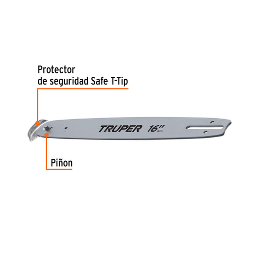 Proveedor:TruperBarra de repuesto 16' para motosierra a gasolina, Truper, 16632Barra de acero para máximo rendimiento Cortes rápidos y precisos Protector de seguridad Safe-T-Tip® que evita el contragolpe Para motosierras...
