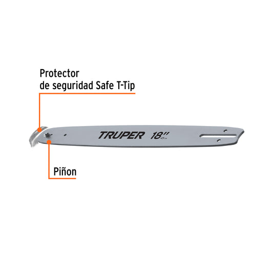 Proveedor:TruperBarra de repuesto 18' para motosierra a gasolina, Truper, 16633Barra de acero para máximo rendimiento Cortes rápidos y precisos Protector de seguridad Safe-T-Tip® que evita el contragolpe Para motosierras...