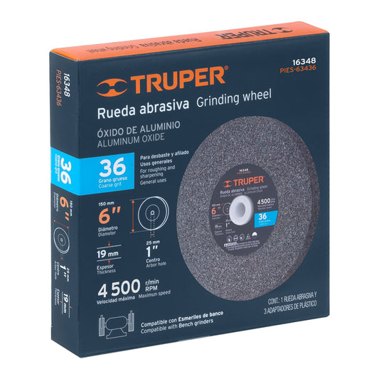 Proveedor:TruperRueda abrasiva p/esmeril 6X3/4', óxido de aluminio, grano 36 Caja con 6, 16348Fabricada en óxido de aluminio Ideal para esmerilar, afilar y rectificar aceros en general, hierro forjado, fierro negro acero al...