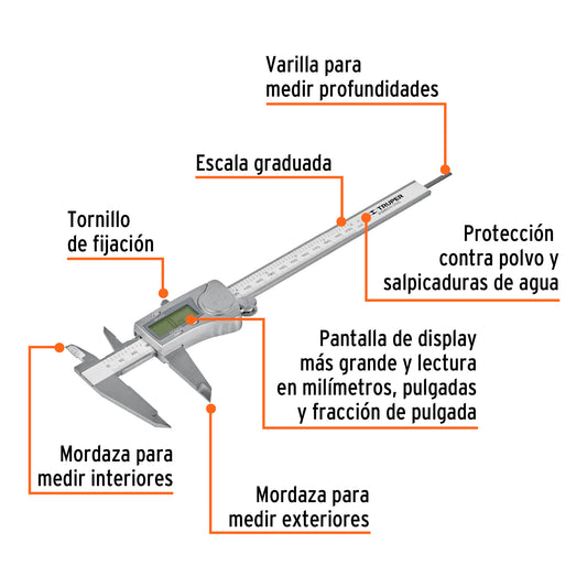 Proveedor:TruperCalibrador vernier digital 6' acero inox, std y mm, Truper, 14388Cuerpo de acero inoxidable Protección contra polvo y salpicaduras de agua Pantalla de display más grande y lectura en milímetros,...