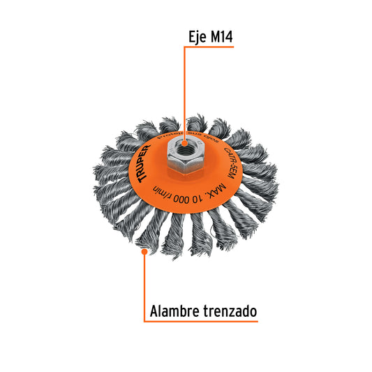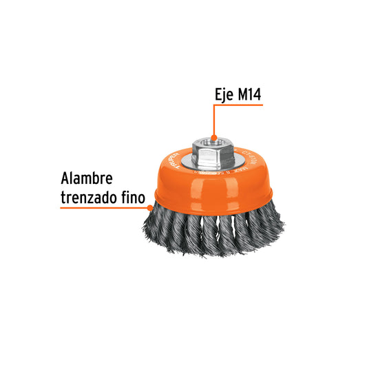 Proveedor:TruperCarda copa 3' alambre trenzado fino, eje M14, Truper Caja con 4, 14184Fabricada en acero al carbono Acabado rugoso Compatible con otras marcas del mercado Para trabajo pesado y desbaste rápido