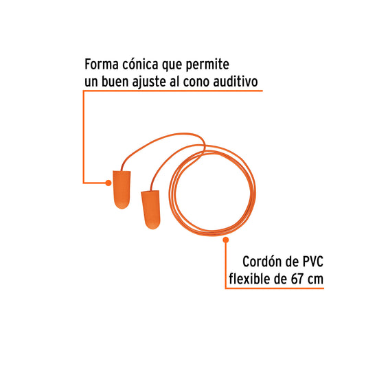 Proveedor:TruperTapón auditivo desechable de espuma con cordón, Truper Caja con 12, 14223Nivel de reducción de ruido: 32 dB (NRR) Cordón de PVC flexible de 67 cm Forma cónica que permite un...