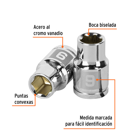 Proveedor:TruperDado de 9 mm, 6 puntas, cuadro 3/8', Truper Caja con 6, 13673Fabricado en acero al cromo vanadio con acabado pulido espejo resistente a la oxidación y de fácil limpieza Sistema de sujeción...