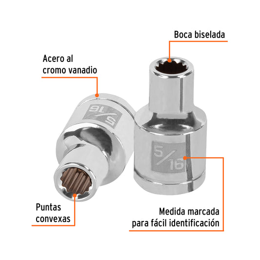 Proveedor:TruperDado de 5/16', 12 puntas, cuadro 1/2', Truper Caja con 6, 13299Fabricado en acero al cromo vanadio con acabado pulido espejo resistente a la oxidación y de fácil limpieza Sistema de sujeción...