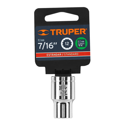 Proveedor:TruperDado de 7/16', 12 puntas, cuadro 1/2', Truper Caja con 6, 13301Fabricado en acero al cromo vanadio con acabado pulido espejo resistente a la oxidación y de fácil limpieza Sistema de sujeción...