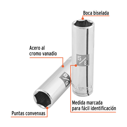 Proveedor:TruperDado largo de 5/8', 6 puntas, cuadro 1/2', Truper Caja con 6, 13327Fabricado en acero al cromo vanadio con acabado pulido espejo resistente a la oxidación y de fácil limpieza Sistema de sujeción...