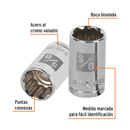 Proveedor:TruperDado de 5/8', 12 puntas, cuadro 1/2', Truper Caja con 6, 13304Fabricado en acero al cromo vanadio con acabado pulido espejo resistente a la oxidación y de fácil limpieza Sistema de sujeción...