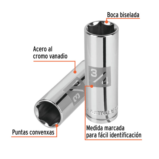 Proveedor:TruperDado largo de 3/4', 6 puntas, cuadro 1/2', Truper Caja con 6, 13329Fabricado en acero al cromo vanadio con acabado pulido espejo resistente a la oxidación y de fácil limpieza Sistema de sujeción...
