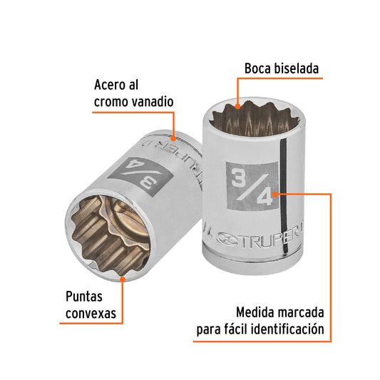 Proveedor:TruperDado de 3/4', 12 puntas, cuadro 1/2', Truper Caja con 6, 13306Fabricado en acero al cromo vanadio con acabado pulido espejo resistente a la oxidación y de fácil limpieza Sistema de sujeción...