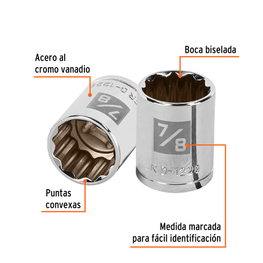Proveedor:TruperDado de 7/8', 12 puntas, cuadro 1/2', Truper Caja con 6, 13308Fabricado en acero al cromo vanadio con acabado pulido espejo resistente a la oxidación y de fácil limpieza Sistema de sujeción...