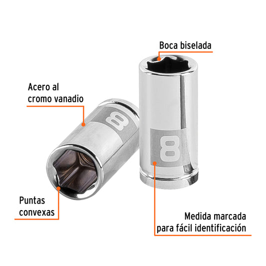 Proveedor:TruperDado largo de 8 mm, 6 puntas, cuadro 1/4', Truper Caja con 6, 13202Fabricado en acero al cromo vanadio con acabado pulido espejo resistente a la oxidación y de fácil limpieza Sistema de sujeción...