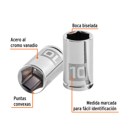 Proveedor:TruperDado de 10 mm, 6 puntas, cuadro 1/4', Truper Caja con 6, 13172Fabricado en acero al cromo vanadio con acabado pulido espejo resistente a la oxidación y de fácil limpieza Sistema de sujeción...