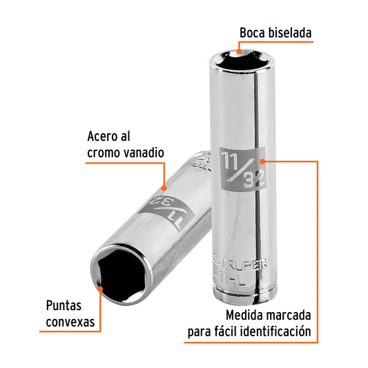 Proveedor:TruperDado largo de 11/32', 6 puntas, cuadro 1/4', Truper Caja con 6, 13185Fabricado en acero al cromo vanadio con acabado pulido espejo resistente a la oxidación y de fácil limpieza Sistema de sujeción...