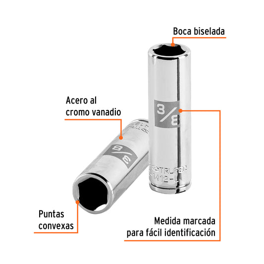 Proveedor:TruperDado largo de 3/8', 6 puntas, cuadro 1/4', Truper Caja con 6, 13186Fabricado en acero al cromo vanadio con acabado pulido espejo resistente a la oxidación y de fácil limpieza Sistema de sujeción...