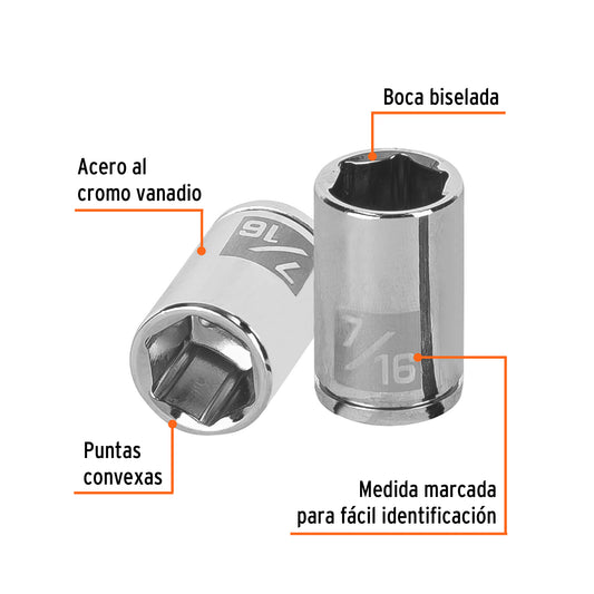 Proveedor:TruperDado largo de 7/16', 6 puntas, cuadro 1/4', Truper Caja con 6, 13187Fabricado en acero al cromo vanadio con acabado pulido espejo resistente a la oxidación y de fácil limpieza Sistema de sujeción...