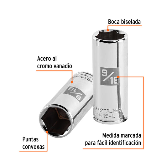 Proveedor:TruperDado largo de 9/16', 6 puntas, cuadro 1/4', Truper Caja con 6, 13189Fabricado en acero al cromo vanadio con acabado pulido espejo resistente a la oxidación y de fácil limpieza Sistema de sujeción...