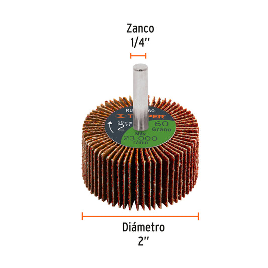 Proveedor:TruperRueda flap de 2', grano 60, Truper Caja con 6, 13037Fabricada en óxido de aluminio Respaldo de algodón con gran flexibilidad Ideal para lugares de difícil acceso Para trabajar sobre...