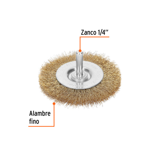 Proveedor:TruperCarda circular 2' alambre fino para taladro, Truper Caja con 6, 11574Fabricada en acero latonado (antichispa) Acabado fino Zanco 1/4" Para pulir y quitar residuos de pintura Ideal para usarse con...