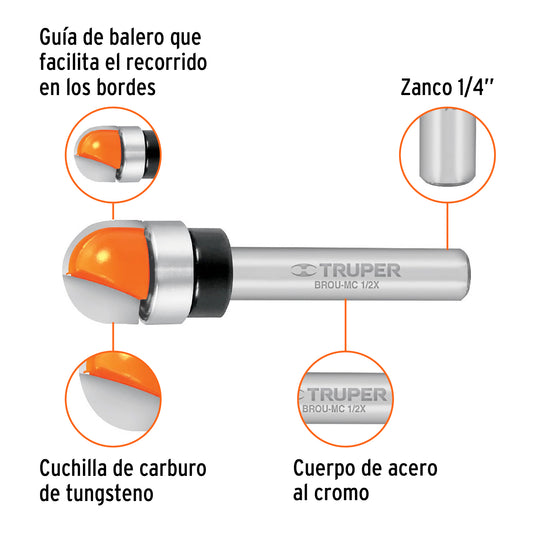 Proveedor:TruperBroca para router, media caña, 1/2' con balero, Truper Caja con 3, 11464Cuerpo de acero al cromo y cuchilla de carburo de tungsteno Guía de balero que facilita el recorrido en bordes...