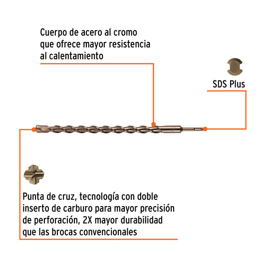 Proveedor:TruperBroca SDS Plus 1 x 10', Truper Caja con 5, 11289Punta de cruz, tecnología con doble inserto de carburo para mayor precisión de perforación, 2X mayor durabilidad que las brocas...