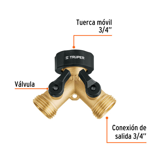 Proveedor:TruperConector 'Y' 3/4' metálico para manguera, Truper Caja con 6, 10372Cuerpo metálico Válvulas para ajustar el flujo o cerrar cada conexión