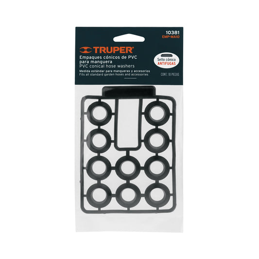 Proveedor:TruperBolsa con 10 empaques de PVC antifuga para manguera, Truper Caja con 24, 10381Fabricados en PVC Medida estándar Diseño cónico más resistente