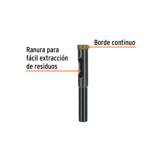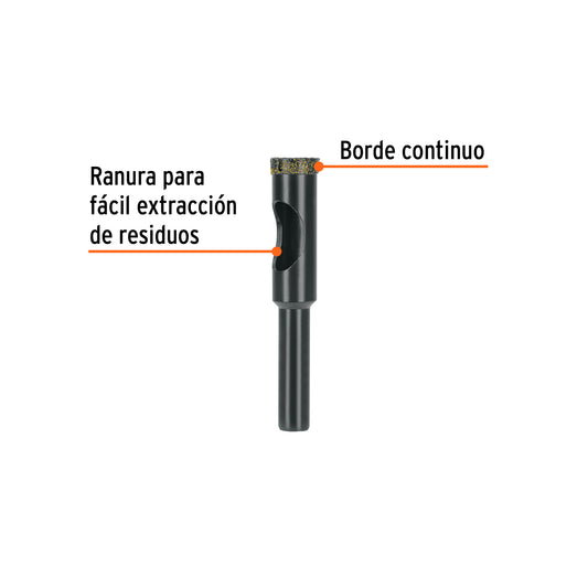 Proveedor:TruperBroca diamantada 12mm (1/2'), TRUPER Caja con 2, 103435Borde continuo y recubrimiento de diamante para cortes rápidos y finos sin despostillar Ranura amplia para fácil extracción de residuos...