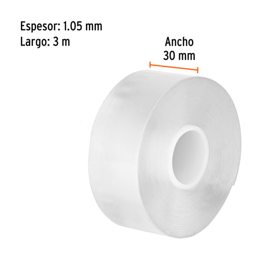 Proveedor:TruperCinta doble cara reutilizable, transparente 3mx30mm, Truper Caja con 6, 103222Fácil instalación sin necesidad de clavar o atornillar Se adhiere a materiales lisos no porosos como metal, azulejo, papel, madera, plástico,...