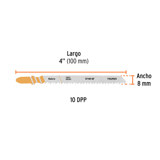 Proveedor:TruperBlíster 5 seguetas T, 10 DPP BIM, corte recto p/ madera dura Caja con 6, 103043Fabricadas en acero Corte rápido Zanco "T" Para sierras caladoras modelos CALA-NX6, CALA-A5, CALA-A4 , CALA-A3 marca Truper® y CALA-P3...