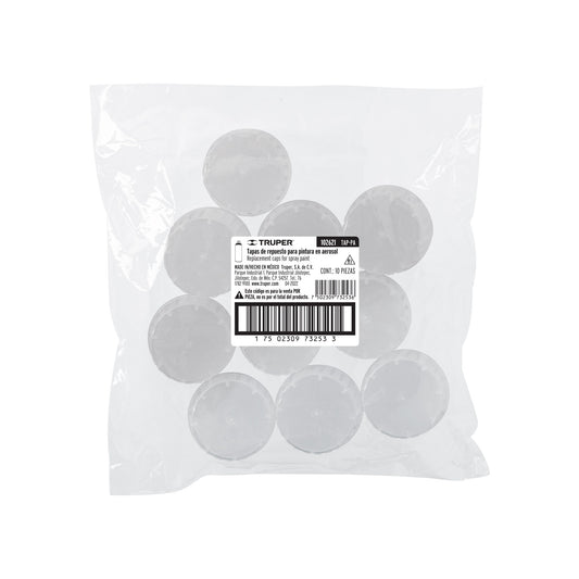 Proveedor:TruperBolsa con 10 tapas de repuesto para pintura aerosol Truper, 102621Compatible sólo con pinturas marca Truper
