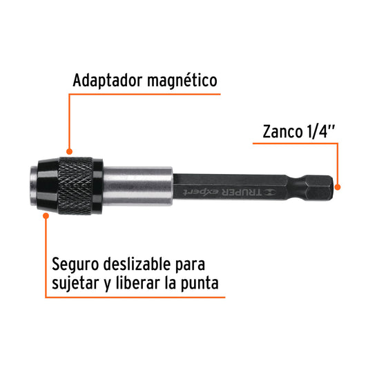 Proveedor:ExpertAdaptador de 125 mm magnético para puntas, Expert Caja con 6, 101964Fabricada en acero al cromo vanadio 2X más resistente al desgaste que las de acero al carbono Seguro deslizable para sujetar y...