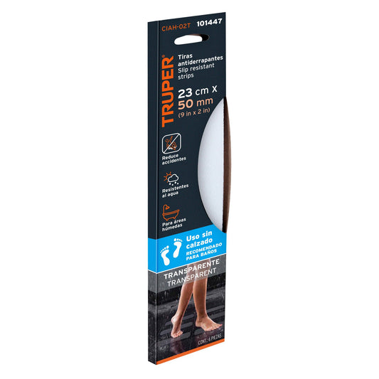 Proveedor:TruperTarjeta 6 tiras 23cm antiderrapantes trans. 50mm área húmeda Caja con 5, 101447Cinta fabricada con polímero texturizado Adhesivo acrílico, resistente al agua y al deslizamiento Sin abrasivo Uso general sin calzado Ideal para...